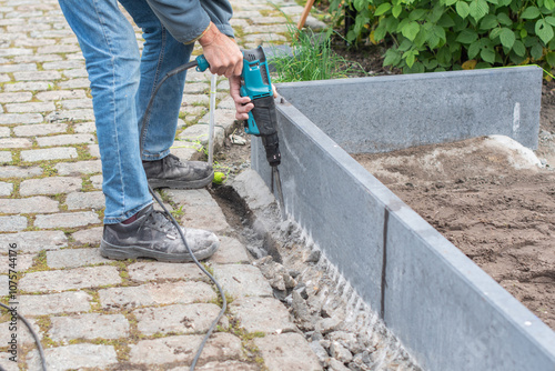 middle-aged man drills holes in the foundation of greenhouse for strengthening, improvement of garden or vegetable garden,frame for beds with soil,concept of home ecological turning of vegetables,