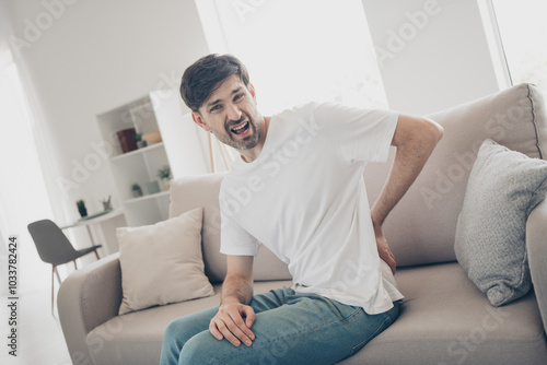 Middle-aged man experiencing back pain while sitting on sofa in bright living room interior with modern decor