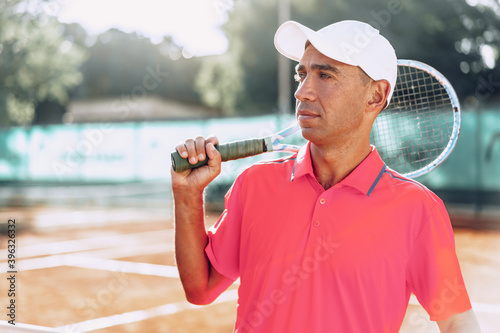 Middle-aged man tennis player with racket standing on court near net
