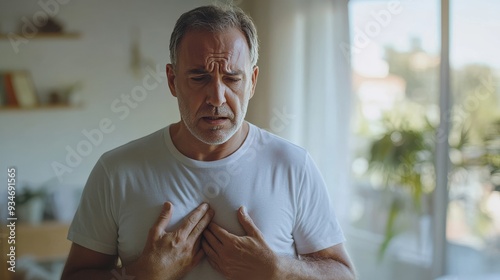 Middle-Aged Man with Graying Hair Holding His Chest in Pain, His Distressed Expression Reflects Discomfort