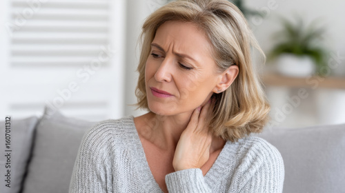 Middle-aged woman experiencing allergic reaction, scratching irritated skin from insect bites and eczema