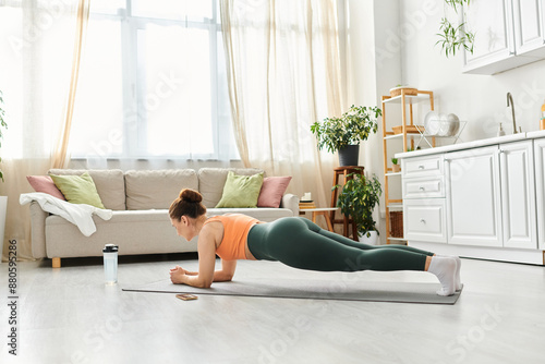 Middle-aged woman gracefully practicing yoga in her home.