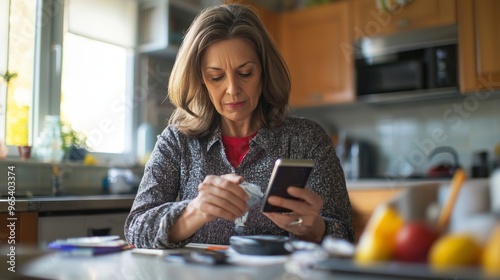 Middle-aged woman with diabetes checks blood sugar levels at home using a digital glucometer while seated at kitchen table