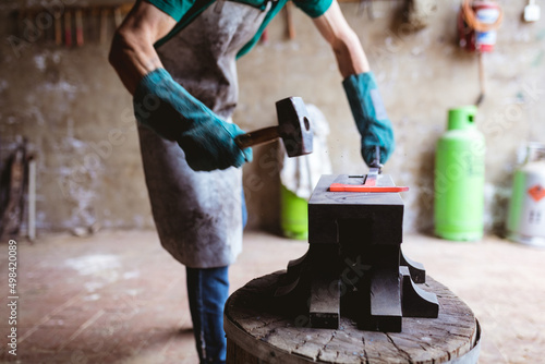 Midsection of blacksmith in protective gloves forging with hammer on anvil in industry