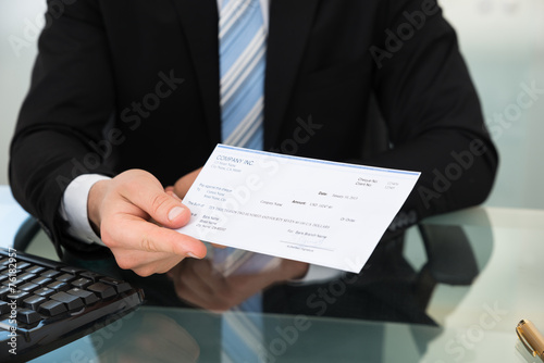 Midsection Of Businessman Showing Cheque