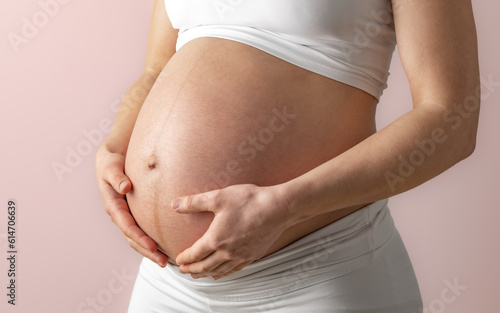 Midsection of pregnant woman gently holding her naked round belly with her hands in final month of pregnancy. Third trimester - week 36. Close up. Side view. Pink background. Bright shot.