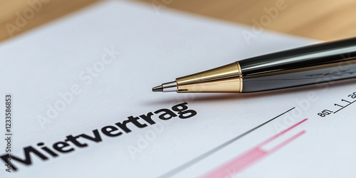 Miet - Vertrag der zur Unterdschrift ist. Kugelschreiber liegt auf dem Tisch. Vertrag - Mietvertrag - Unterschrift - Mietkosten - Wohnung