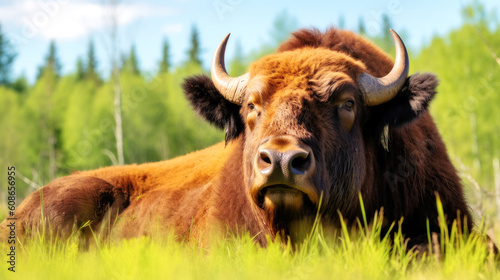 Mighty bison, edge of lush forest, bathed in light from a soft blue summer sky, exudes a serene, quiet power. Generative AI