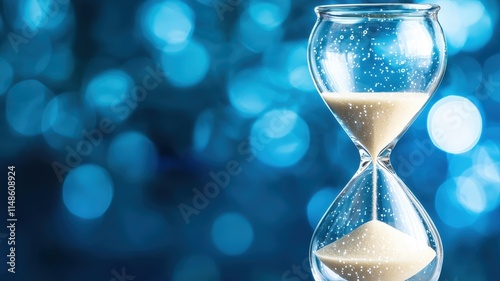 milestone and planning concept. An hourglass filled with sand, set against a shimmering blue background.