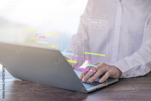 Milestones management shows a Gantt timeline chart. Concept of managing business project plans in software, organizing schedules in digital calendars. progress planner, work update, diagram design