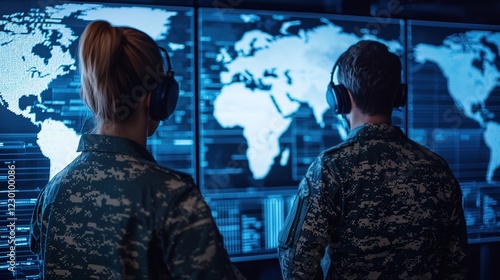 Military analysts in high-tech command center monitoring global strategic intelligence displays