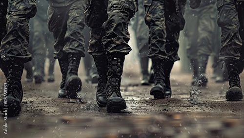 Military Boots Marching on Muddy Path