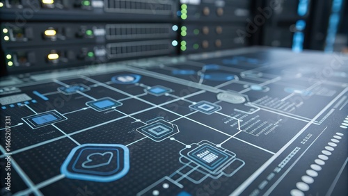 military cyber defense systems Futuristic server room with intricate digital interface and blue lighting.