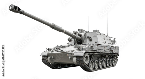 Military heavy artillery tank with long barrel and tracks on transparent background