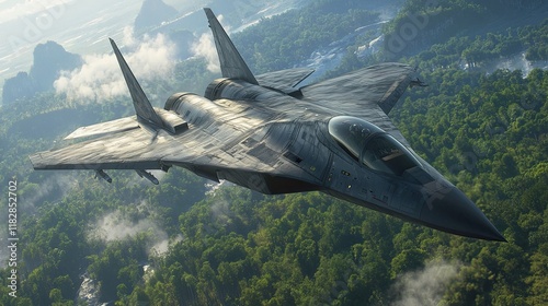 Military jet soars over lush forest landscape during daylight in a dramatic aerial display