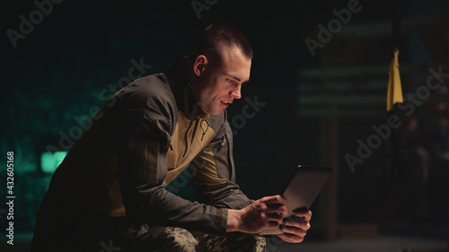 Military man making video call in dark gym