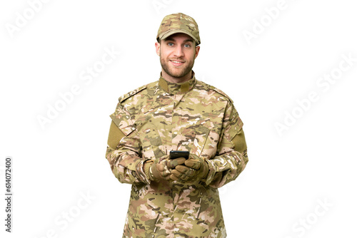 Military man over isolated chroma key background sending a message with the mobile