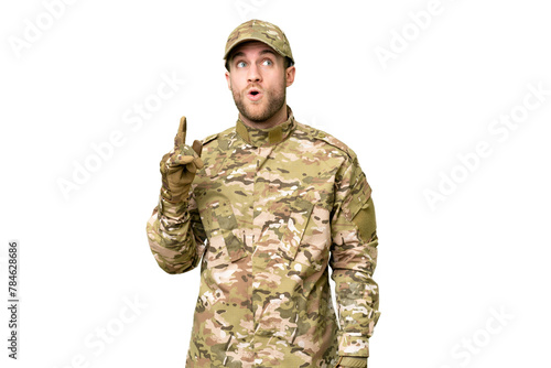 Military man over isolated chroma key background thinking an idea pointing the finger up
