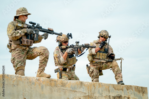 Military or soldier team with gun stay on concrete wall and prepare for battle with enemy in field with day light.