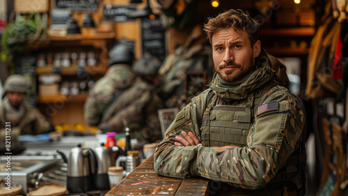 military personnel in a hipster coffee shop drinking coffee. sunny day generative ai