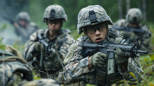 Military personnel in action, wearing combat uniforms and tactical gear, representing the armed services' commitment to defense.
