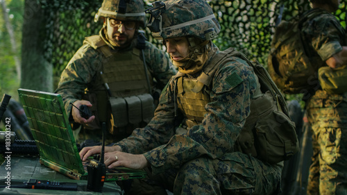Military Staging Base, Officer Gives Orders to Chief Engineer, They Use Radio and Army Grade Laptop. They're in Camouflaged Tent in a Forest. They're on Reconnaissance Operation/ Mission.