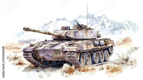 Military tank assembly , rugged textures, and a muted desert palette,