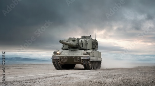 Military Tank Moves Through a Rugged Landscape at Dusk