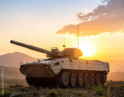 Military tank silhouette at sunset against mountainous landscape in warm sky hues