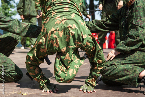 Military training. Training soldiers for military operations. Guys in uniform perform exercises. Military in active action.
