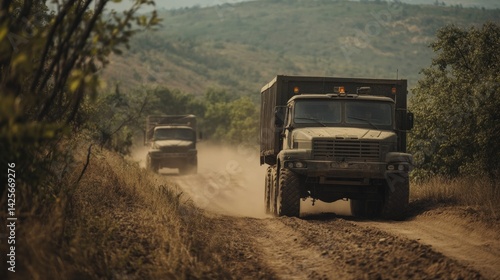 Military transport trucks in a convoy through rugged terrain, armored and well-equipped, dusty atmosphere,