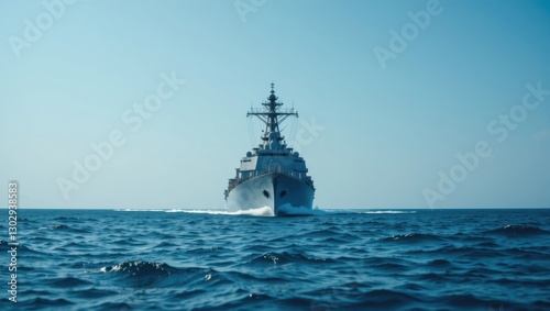 Military Vessel Navigating Through Calm Ocean Waters Under a Clear Blue Sky