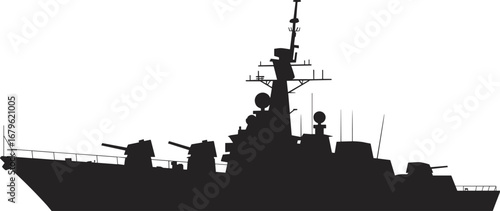Military Warship Silhouette Vector Side View with Cannons, Radar Antennas, and Naval Equipment on White Background for Design