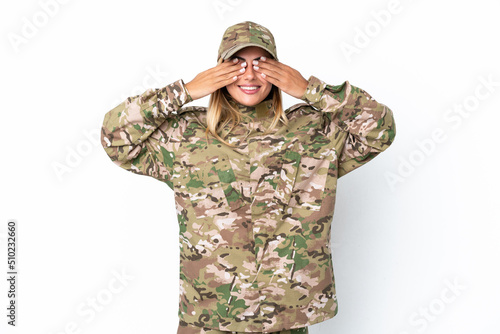 Military woman isolated on white background covering eyes by hands