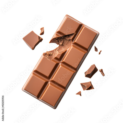 Milk chocolate bar with broken pieces and creamy texture on transparency background