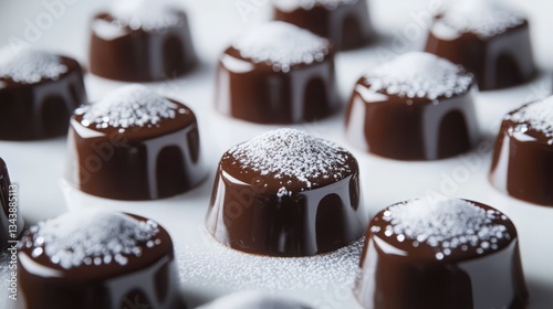 Milk chocolate mousse covered with smooth, shiny mirror glaze, topped with sparkling powdered sugar. Presented in geometric pattern on clean, modern surface.