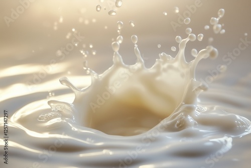 Milk pouring and splashing into ripples, every droplet glowing under soft light.