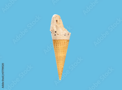 milk tea flavor ice cream cone with couple of bites on a blue background horizontal composition