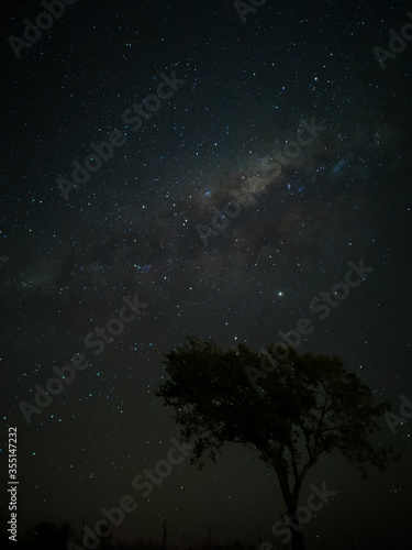 Milky Way in starry sky with tree and landscape below, timelapse sequence image 20-100 Night landscape in the mountains of Argentina - Córdoba - Condor Copina