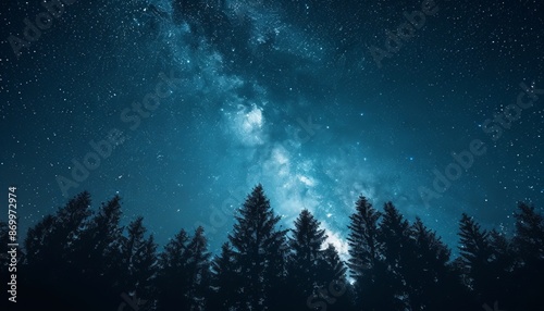 Milky Way over forested landscapes on a summer night, captured in dark sky-blue and black tones. Enhanced with focus stacking and cross-processing, showcasing ethereal silhouettes in space. ππ²