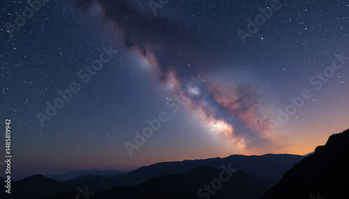 Milky Ways ethereal glow over dark mountain silhouettes at twilight