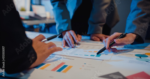 Millennial Asia people meeting brainstorming ideas about new paperwork project colleagues working together plan success strategy enjoy teamwork in small modern night office. Coworker teamwork concept.