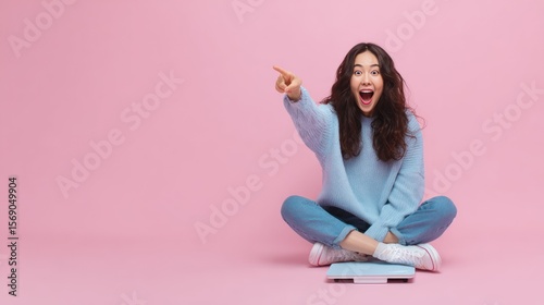 Millennial Asian woman sitting casually on floor with scale under her, pointing at digital screen with excitement, pastel background and right side empty for copy or branding