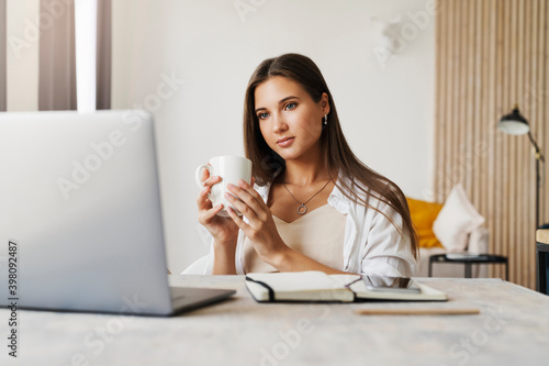 Millennial girl is sitting at laptop, studying remotely. Student uses online distance learning opportunities.