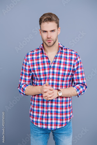 Millennial guy wearing casual. Male beauty. Handsome young man. Portrait of man in casual shirt keeping arms crossed isolated on grey. Unshaven man skincare. Male beauty and hairstyle