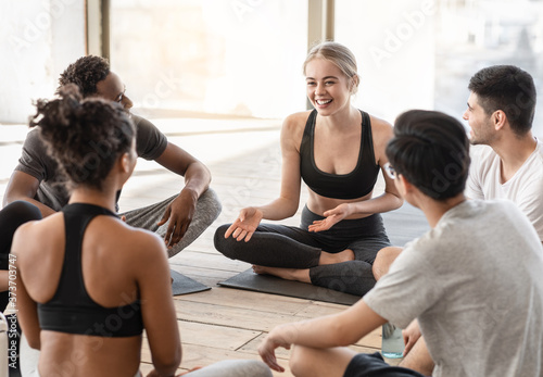 Milti-ethnic group of sporty people chatting and laughing before training in studio