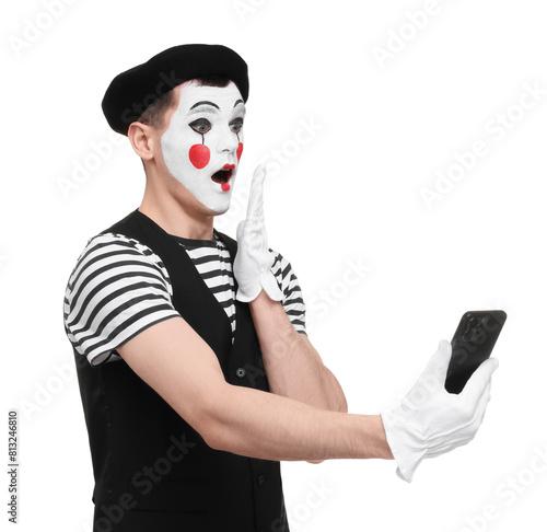 Mime artist with smartphone making shocked face on white background