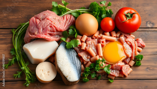 Minced barf raw food recipe ingredients for dogs consisting meat, organs, fish, eggs and vegetable, mindfulness theme. with white shades