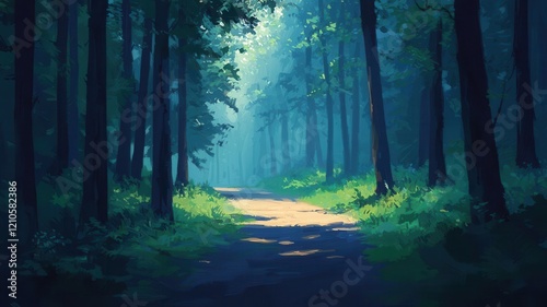 Mindful living with wellness and consciousness concept. Serene forest path illuminated by soft sunlight through trees.