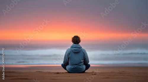 Mindfulness Meditation at Sunset: Person on Beach, Calm and Peaceful Ocean View